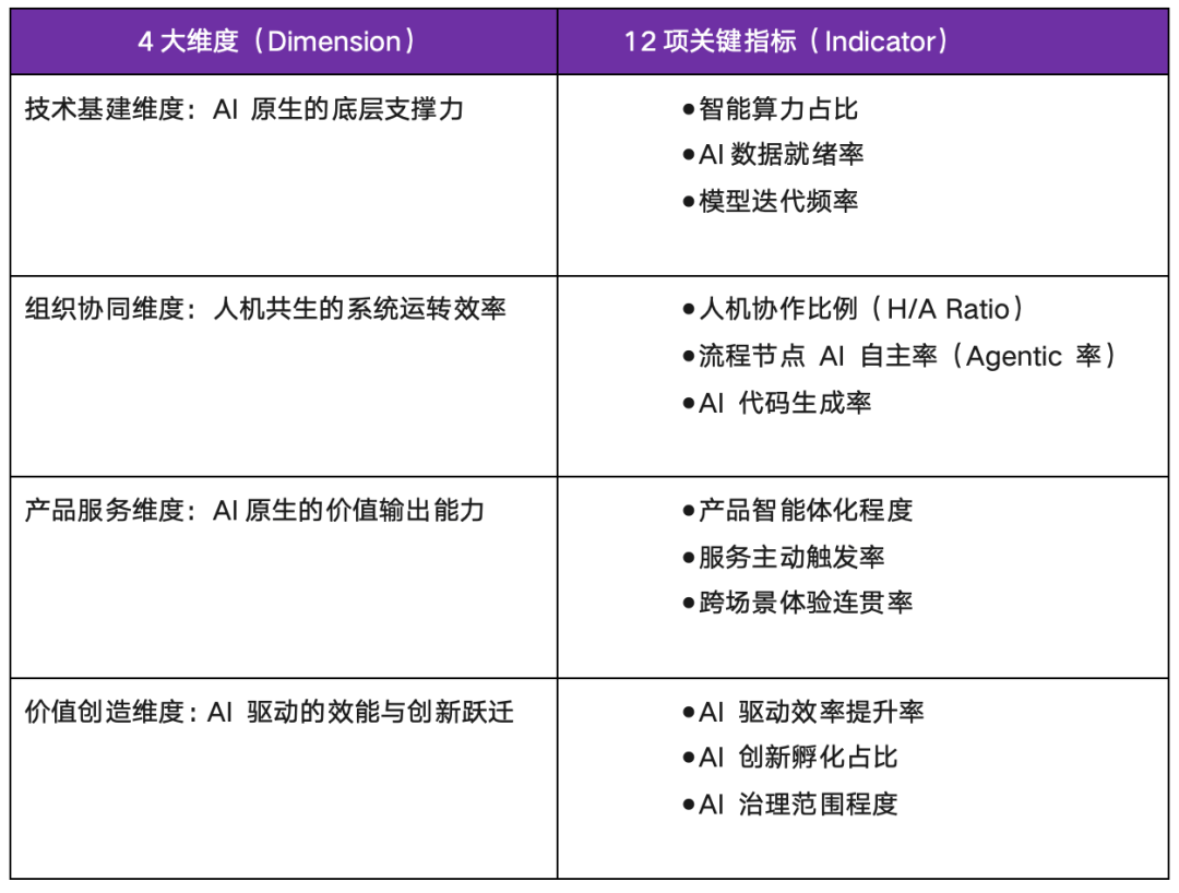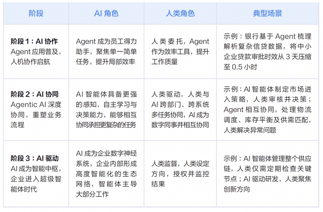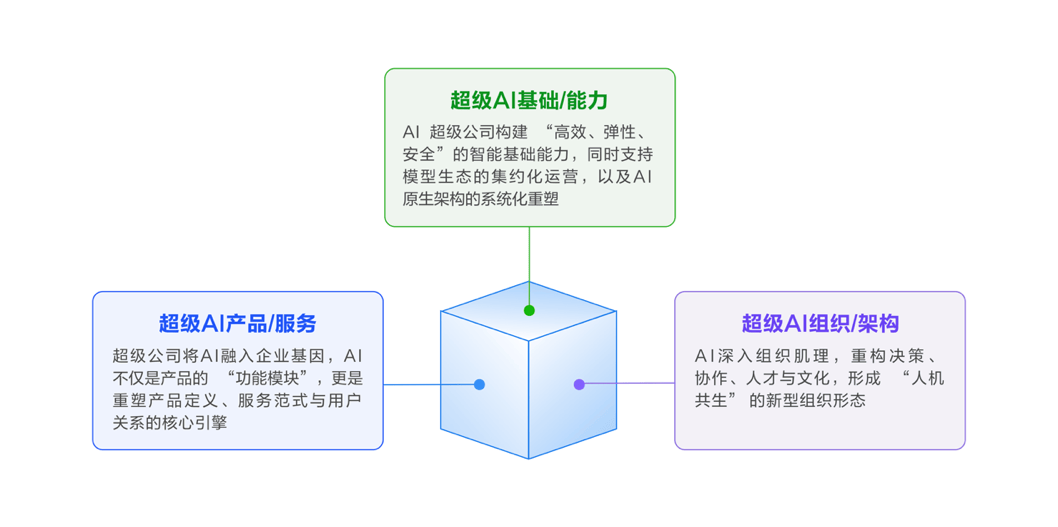 是将 AI 深度融入企业基因,依托东西实现取现实施行,将用户从操做者改变为委托者。以人机协做、AI 智能协同为焦点驱动力的新型组织形态。标记着 AI 从单点东西向系统级出产力改变,跻身 AI 超等公司行列。AI 超等公司的成长分为 AI 协做、AI 协同、AI 驱动三个阶段,以至更久?跟着 Agent 手艺成熟,这条道大概需要十年、二十年,可建立包含4大维度、12项环节目标的评估系统,组织/架构维度,软件产物层面。