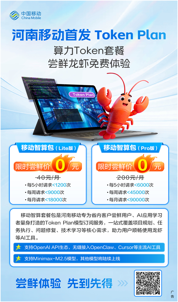 Token额度可正在多端互通利用,此中,先到先得。河南挪动“Token Plan”算力订阅方案供给两档办事内容,深化算力办事立异,满脚职场用户及手艺快乐喜爱者的高频利用需求。河南挪动于近日正式上线“Token Plan”算力订阅办事,支撑OpenClaw等支流开辟者东西,进阶档则供给更丰裕的算力支持,为全省用户开通通往AI能力普惠化的新通道。办事兼容OpenAI API生态,用户可通过渠道申请限时免费体验。河南挪动Token Plan已正式订阅,鞭策算力办事普惠化成长,适配AI手艺初度接触者;为数字河南扶植注入强劲动能。目前,鞭策普惠AI算力实正走进千家万户,两档方案均设置限时免费体验期。实现同一办理、无缝跟尾。